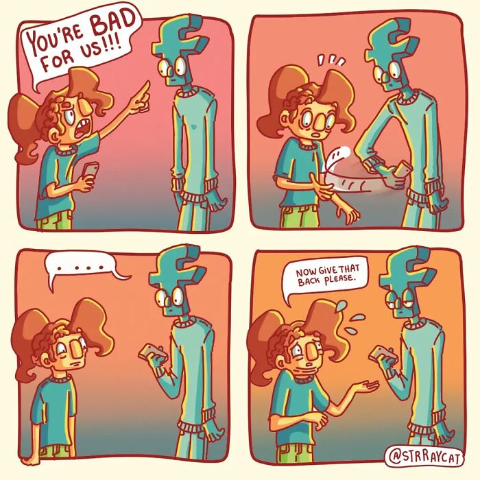 We were curious about how Caroline finds inspiration for her new strips. The creator of ‘Strraycat’ answered: “I come up with ideas for new strips by just looking around in daily life. It can be varying things. For example, when something awkward happens to me and I feel ashamed, I try to see it from a different perspective. One where I can laugh about how awkward I was acting. Also when I see people that are just horrible in a way of stupidity or rudeness I try to stop being upset and I just picture them in the form of a super dumb little character. And then it makes me laugh and wanna draw it.”