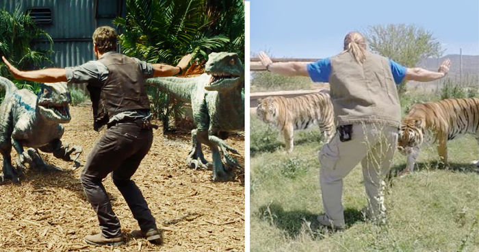 Tumblr user feminerds started the Jurassic-craze this Wednesday, when she posted a screen capture of the scene alongside a photograph of a zookeeper reenacting the pose with three walruses. Since then, dozens have posted their own versions under #JurassicZoo, #ZoorassicWorld, and #PrattKeeping.