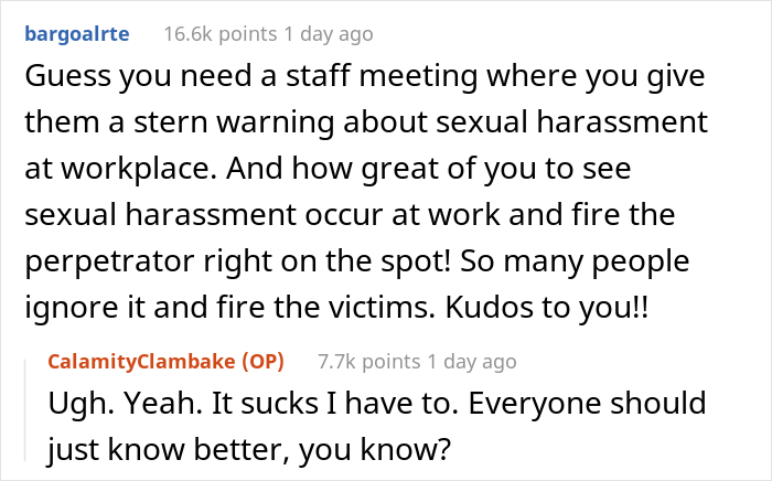 Readers are applauding the owner for not tolerating harassment and sharing their own examples of experiencing harassment in the restaurant industry