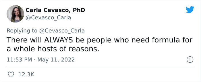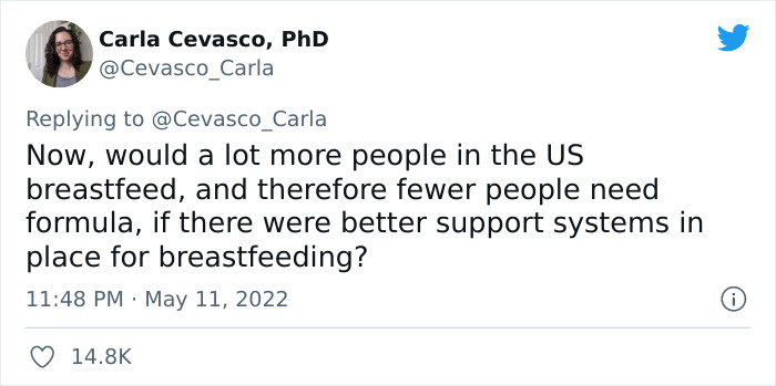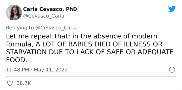 Earlier this year, a severe infant formula shortage hit the United States. This is a frightening situation for parents to find themselves in, as many babies rely on formula as a supplement to breastmilk or as their primary source of nutrients. Some people do not see the severity of the shortage and assume that formula is not a necessity when babies can just breastfeed like they did “back in the day”. To debunk this myth that all babies in the past were breastfed, historian of infant feeding Dr. Carla Cevasco went on Twitter and explained the importance of access to formula. Below you can read her informative thread, as well as some of the responses it has received from concerned readers. Then if you’re interested in hearing from a mom currently struggling with this frightening shortage, you can check out this Bored Panda piece next.