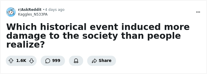 Someone recently asked, "Which historical event induced more damage to society than people realize?" and the answers came pouring in faster than a car's tank being filled with gasoline... From leaders who wiped out millions of people, to Chernobyl's contribution to climate change, netizens dug deep to draw attention to the incidents and eras that they believe need to be shamed.