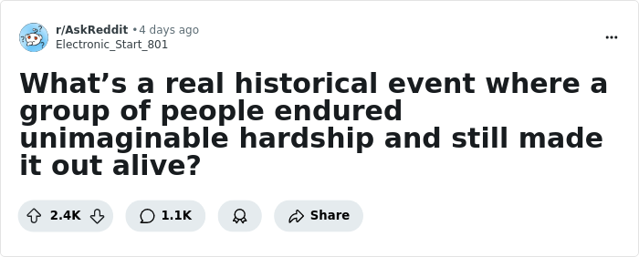 Someone asked "What's a real historical event where a group of people endured unimaginable hardship and still made it out alive?"