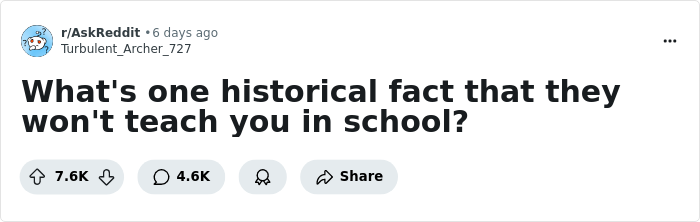Someone asked “What's one historical fact that they won't teach you in school?” and people shared their examples, ranging from “I didn’t pay attention” to some things that are truly obscure. So get comfortable as you read through, upvote your favorites and be sure to share your own thoughts in the comments below.