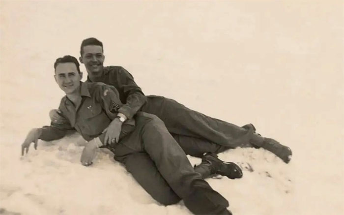 In 1945, these two soldiers had hiked up into the Austrian Alps and a friend took their picture as they embraced in the snow.