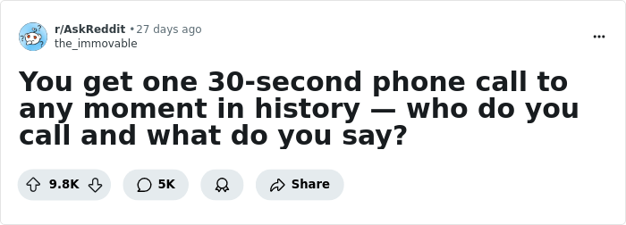 These fantasies seem ridiculous, as we all know that such a phone doesn’t exist, but it sounds super useful. So, folks instantly delivered when a Reddit user enquired, “You get one 30‑second phone call to any moment in history — who do you call and what do you say?” Here’s what they had to say!