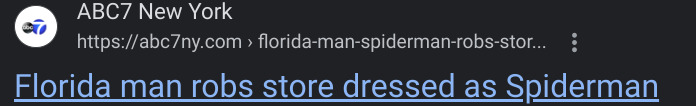 Load More Replies...Just Google "Florida Man" and whatever day of the year, and you'll definitely find something silly. Example for today's date (March 13th): Florida man in Spider-Man mask steals bottles from liquor store, deputies say.