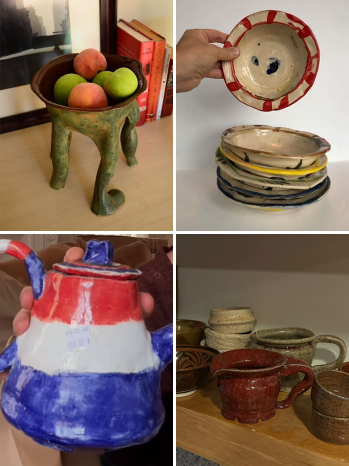 Handmade pottery. I have been having the time of my life at thrift stores finding the coolest handmade pottery. I don't care if it's like a bowl, a sculpture. I even found like a tea kettle recently. It's like red, white, and blue. Definitely someone's 4th grade, like, art project, but it's in my home now, and it feels special and fun.