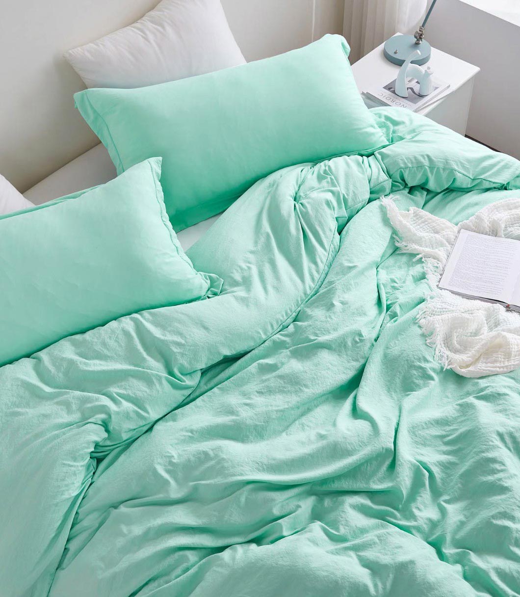 Design your bedroom by adding mint green bedding and accent pillows. Shades of mint green help to create an extra calm and inviting mood. You can choose from different types of bedding, such as comforters, duvets, or sheets with mint green as the primary or accent color.