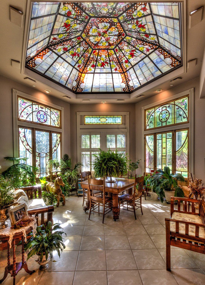 Stained glass windows in a sunroom infuse artistic flair with vibrant hues. As the sun’s rays filter through the intricate patterns, they create a mesmerizing play of colors, casting a kaleidoscope of light across the space. These windows add a touch of elegance and evoke a sense of timelessness and wonder in your sunlit haven. Strategically placed, it can create a sense of privacy.