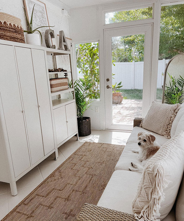 Create a laid-back and eclectic sunroom by mixing patterns, textures, and colors. Layer vibrant rugs, throw pillows, and blankets in various prints and hues. Incorporate rattan or wicker furniture, floral cushions, and poufs for a relaxed seating arrangement. Hanging macramé wall art or plants can fill the sunroom with boho charm.