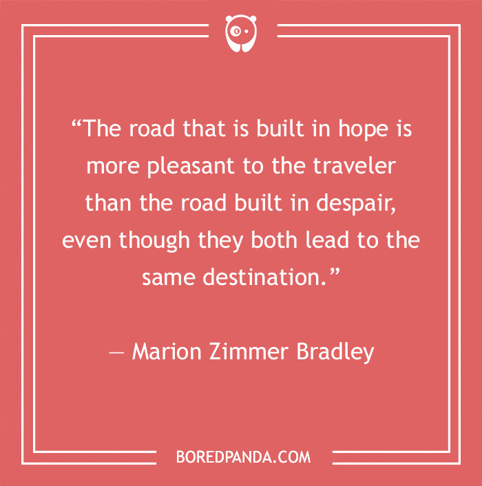 “The road that is built in hope is more pleasant to the traveler than the road built in despair, even though they both lead to the same destination.” — Marion Zimmer Bradley