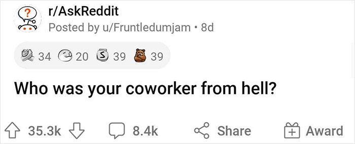 Interview With AuthorYou might think that your actual job is the most important part, but what’s equally vital is working with the right people. The colleagues who surround you and help make up the atmosphere in your workplace can either lift you up with their support or make you curse the day you ever set foot through the door. The friendly folks of Reddit have been sharing their facepalm-worthy stories about the very worst coworkers they’ve ever encountered after user Fruntledumjam started up a thread about colleagues from hell on r/AskReddit. The thread went viral with 35.3k upvotes, 132 awards, and a whopping 8.4k comments.