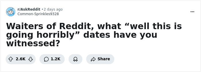 A Reddit user who goes by the nickname Common-Sprinkles9328 recently asked all the waiters on the platform to describe the tables they served where love went to die—and they delivered. Here are some of the most painfully awkward and hilariously disastrous dates they had to witness... because someone had to bring the bread while the night crumbled.