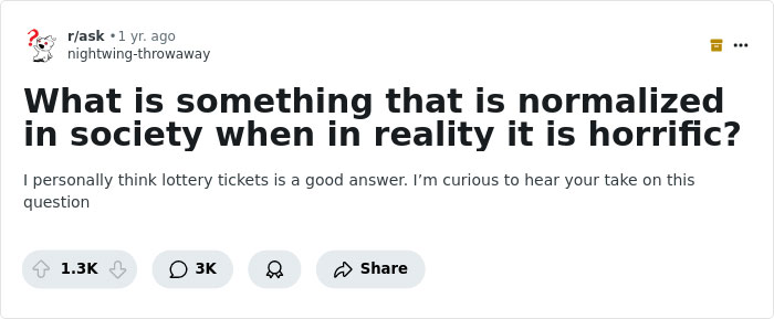 Someone asked “What is something that is normalized in society when in reality it is horrific?” and people shared their best examples. So get comfortable as you scroll through, prepare to shake your head, upvote the worst ones and be sure to share your own examples in the comments below.