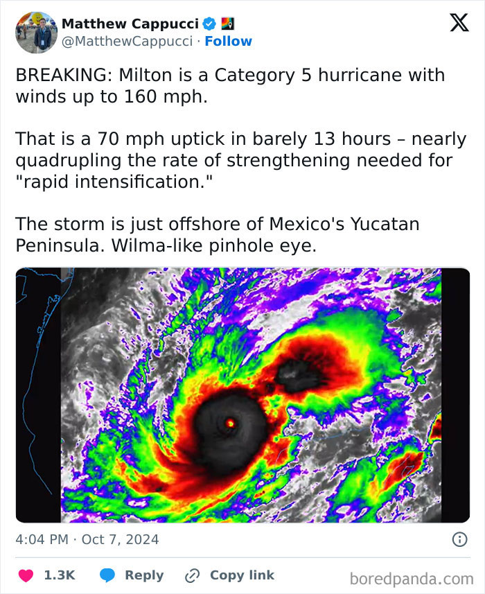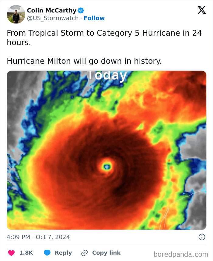 Storm chaser Colin McCarthy said that “Hurricane Milton will go down in history” as it went from a tropical storm to a Category 5 hurricane in only 24 hours. Also, meteorologist Dylan Federico pointed out that Milton is the second fastest hurricane on record to go from Category 1 to Category 5 in the Atlantic Basin.