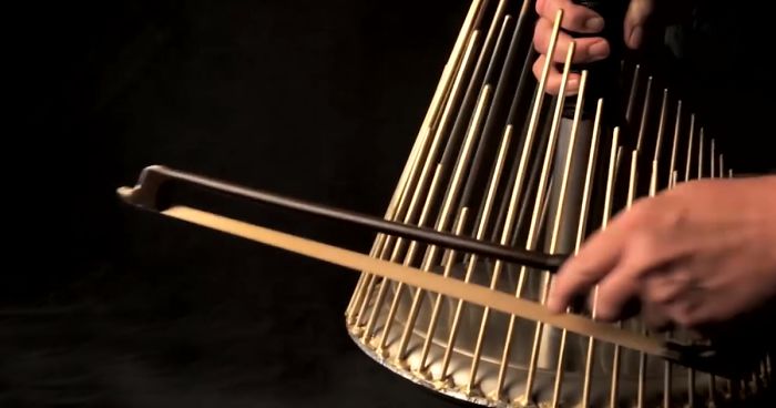 This instrument is called a waterphone and it’s often used to create creepy sounds in movies. It is an inharmonic acoustic percussion instrument and consists of a stainless steel resonator with a cylindrical ‘neck’ and bronze rods of different lenghts and diameters around the rim of the bowl. The instrument was invented by Richard Waters in 1968 or 1969. Waterphones were used in movies like The Matrix (1999), ALIENS (1986), and others.
