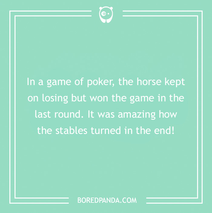 In a game of poker, the horse kept on losing but won the game in the last round. It was amazing how the stables turned in the end!