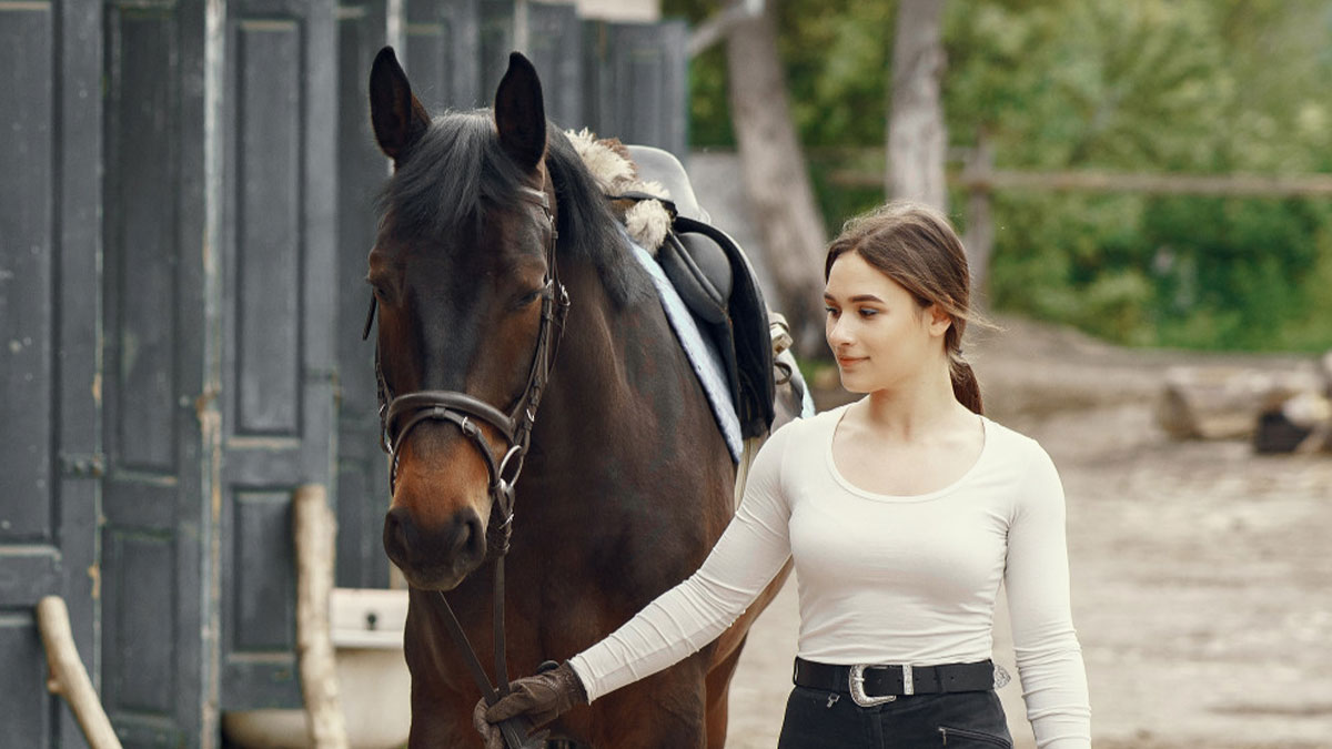 Young woman walking a horse near stable, illustrating family and labor dynamics with business under current challenges.