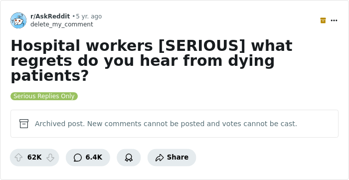 Someone on the web asked hospital workers, “What regrets do you hear from dying patients?”, and folks who’ve been there in people’s last moments shared the words that hit them the hardest. Here’s a list of some of their most profound responses.