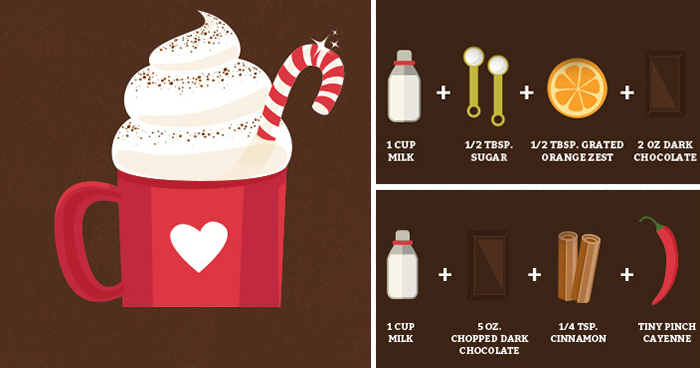 SheKnows.com collected the best hot chocolate recipes and whipped up a neat infographic chart. The chart contains ten great hot chocolate recipes, at least one of which will probably make your mouth water. From the trendy pumpkin spice recipe, to the much-adored Nutella recipe, all of the flavors are truly devious. Just be sure to warm all of the ingredients in a pan, top it off with some marshmallows or whipped cream, and cuddle up with a book for an especially cozy evening!