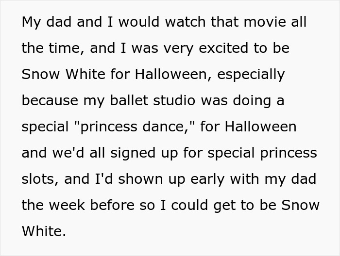 Once upon a time, Reddit user ThrowRAhalloweendred was obsessed with Snow White to the point where she would do chores just like the princess and kept watching the movie with her dad. She also dreamed about dressing up as her for Halloween in a princess dance at her ballet where she had booked her slot well in advance.