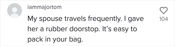 Load More Replies...What kind of Mad Max Hotels are she staying at? Are there any evidence or studies made to back up this extreme measures. Only tip really god was about the fire exits, that is always on the list. But barricade oneself apart from simply lock the door seems extreme. Havent seen any evidence hotel attacks are common enough to warrant it. Wearing a helmet everytime you walk outside in trafficed streets prob do more for your total safety statistics.