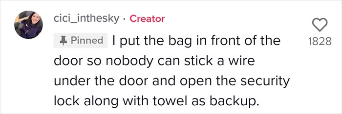 Load More Replies...What the flock! Some of the above points are incredibly bad advice. What this person has mainly prevented is them being able to exit quickly, or firefighters being able to conduct a rescue if they become trapped by a fire. DO NOT put a bag behind your door or furniture in front of interconnecting doors. DO NOT put a wash cloth in the door lock. DO NOT obstruct the peep hole, they are unidirectional, just check it has been installed the right way around. NEVER EVER obstruct or mess around with a fire door or fire exit. (I will now take off my work hat and go back to looking at cat memes.)