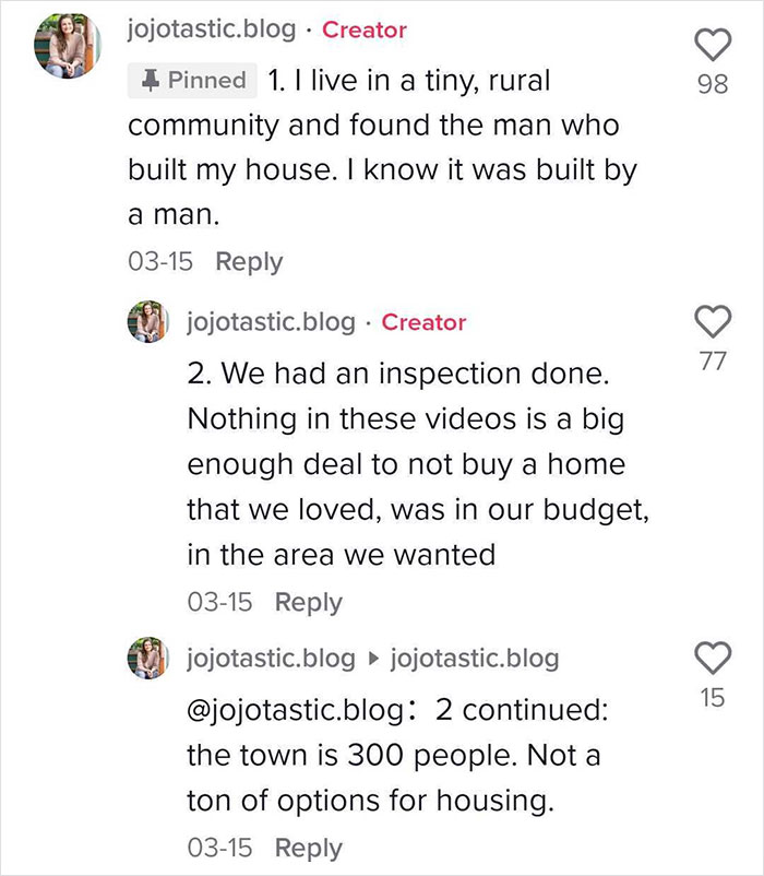 Bored Panda reached out to Joanna and she was kind enough to tell us all about her video series, moving to the remote cabin, and how she feels about having such a massive following. "Sometimes it blows my mind that I have such a large audience, especially because I'm just a woman in the woods with fancy chickens and satellite internet posting satirical videos of my house on the internet!" she quipped. Meanwhile, Ariane Sherine, the editor at ‘These Three Rooms,’ answered Bored Panda's questions about why builders make decisions that might feel illogical and how to embrace homes being imperfect. Read on for our full interviews with Joanna and Ariane, Pandas!
