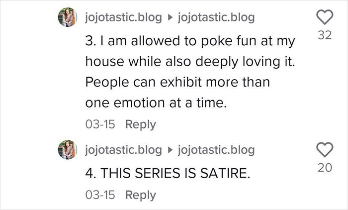 After going viral, Joanna explained that the series is satire and she absolutely loves her quirky house
