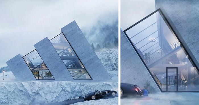 Share on FacebookThey all look cool but I'm not sure how practical or safe they would be (weather, weather extremes, natural disasters etc.) but that depends where they would be be built, I guess. Example: they put the Adidas house in snow and ice but the snow (or water) would have trouble sliding down the long part of that roof and if it's not isolated good enough after a while it could come to mold growing inside, and glass exterior walls in icy, snowy mountains are bad idea for the heating bill (and for the environment because Earth's resources)
