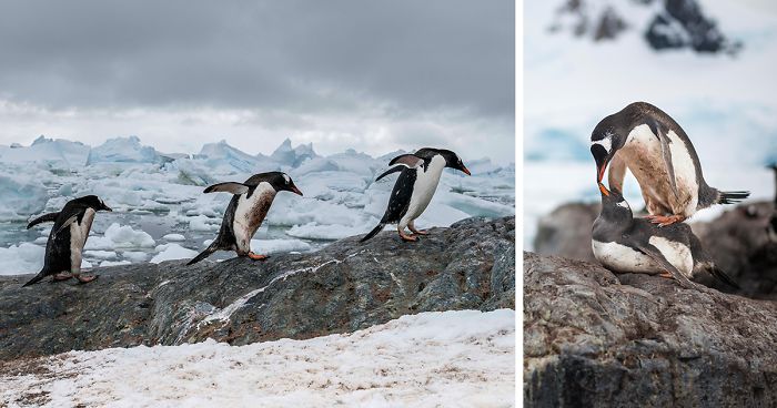 One one side the ice melted provides Gentoo, Adelie and Chinstrap penguins with more breeding space