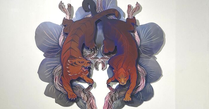 The last piece we see is called “Grip of Confusion.” “This work depicts a black panther restraining a sleeping or wounded girl and a leopard shielding a wounded boy. Are the children prey or are they being protected?” “Grip of Confusion” refers to the bewildering paradox inherent in the scene: on one hand, these majestic animals are protectors of their species, but on the other, they are forced to subdue those whose actions lead to the widespread extinction of their kindred.