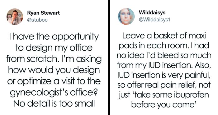 Dr. Ryan Stewart understands that, so he went to Twitter to ask people what they would like to see in a gynecologist's office before he opens his own practice. He asked, “How would you design/optimize a visit to the gynecologist’s office?” and over 3k people came to say their piece.
