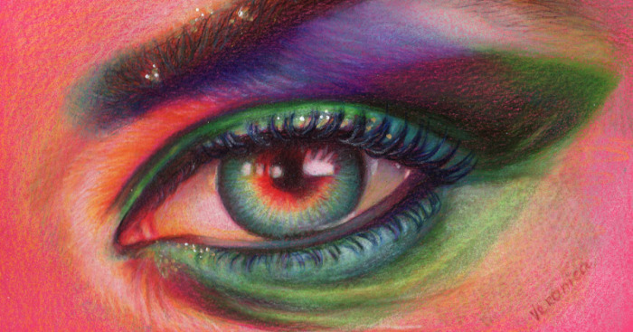 It’s hard to draw the entire portrait at once. To practice, you can start drawing facial features separately to gain an understanding of how light shapes the form. Draw the eye, nose, lips, ear separately many times. Below you’ll find an example of me drawing the eye in colored pencil.