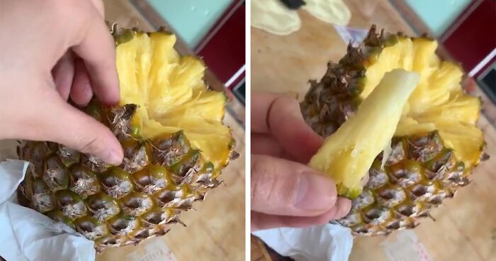 The result? Well, sure enough, they were able to pull out individual pineapple flesh spikes, and that’s all without having to cut or break open the fruit itself.