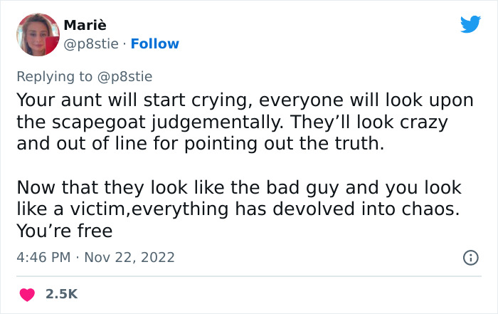 The Twitter user shared some elaborate but recognizable things one can do in order to bring mess and chaos into the household. Once the family is irritated, it’s time to use the scapegoat who has become triggered by the things they think others say about them, so they finally break down, creating even more chaos, making everyone think that they’re the one to blame. The woman shared that this is the perfect time for you to leave and enjoy your evening by going to a party or enjoying “the Black Friday sales”.