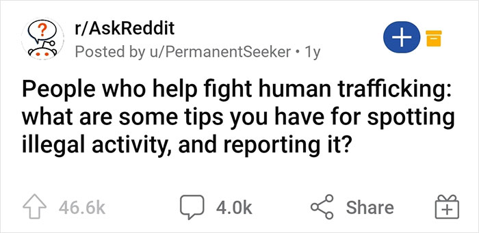 Bored Panda got in touch with redditor u/PermanentSeeker, who started up the informative thread in the first place. They told us that they were inspired to create the thread because of a number of news stories in their area about people being trafficked or almost becoming victims of trafficking. "It was frightening and disheartening to hear about how much could be going on even in the region around my hometown, a relatively rural area, not a large city). So, I wanted to know if there was anything that I as a regular individual could do to help. I hoped that some people might have more knowledge than I do!" they shared.