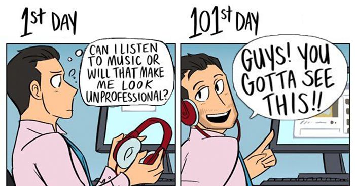 We’re all eager to impress when we get a new job. We come to work on time. We want our boss to like us. We want EVERYONE to like us. But over time this eagerness fades and your exciting new job becomes just another thing you have to do to pay the rent. Check out these funny comics to see how your attitude towards work changes over time. They were drawn by Karina Farek for College Humor and we’re sure you’ll find something to relate to.