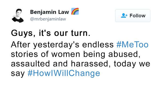 Australian journalist and screenwriter Benjamin Law has created the hashtag #HowIWillChange in response to Milano's effort. He used it as a tool to publicly announce his support and to commit to change against the culture of sexual violence.