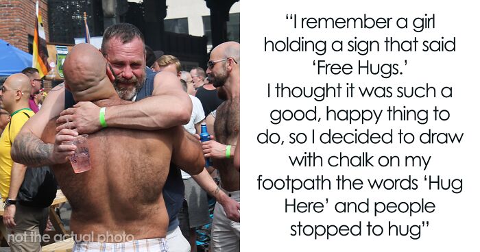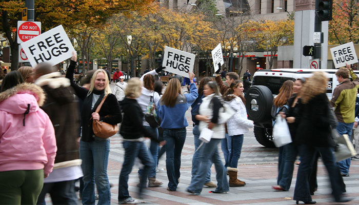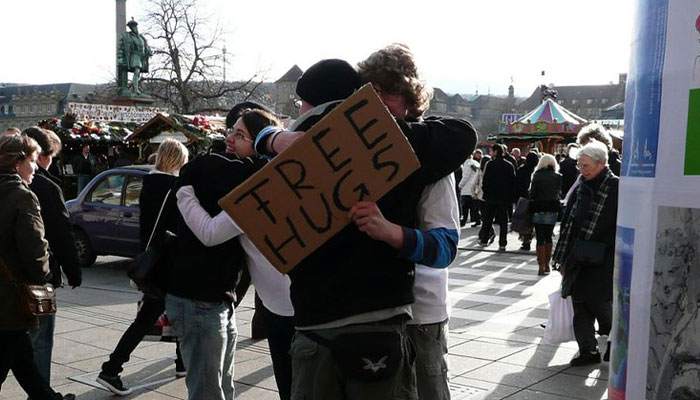 The random acts of hugging strangers to make their day better started in 2004 by a person who goes by Juan Mann