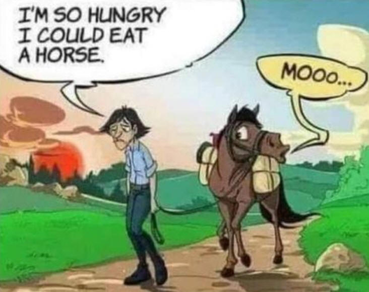 i once went to a horse farm and said, "I'm so hungry i could eat a h-" and everyone looked at me.