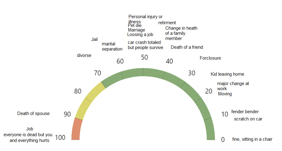 Next time you experience stress look at the scale gage were your stress really falls and trying to look at the stress in perspective. By gradually retraining our brain to realize we are not going to die each time we do something a little bit stressful we can grow new pathways in our brains..