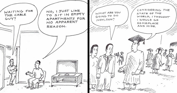 As he told Bored Panda, his inspiration doesn’t come from a mountaintop sage but rather from “daily life, along with the odd and absurd things that we humans say and do.” Influenced by generations of great cartoonists and humorists, Bilgrey’s strength lies in finding comedy in the ordinary and delivering it with clarity, precision, and a dash of playful irony.