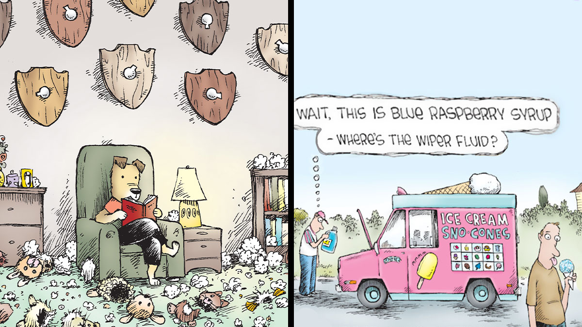 The artist went on to give us a glimpse into his creative process: “Single panels create a whole new world every day so the cast of characters changes every day, but those characters have to be drawn to fit that day's particular world and particular gag. The people and animals must have a look, and more importantly a facial/body expression, that best tells the joke. For instance, sometimes a character needs to look passive or deadpan, so they'll either have dot eyes or glasses (even the animals), while other times the eyes need to express a reaction. Getting that wrong can spoil a joke, but getting it right can add an important element of visual humor to a verbal gag. The best cartoons are when the idea and the words (when there are some) and the drawing work together to make it humorous on all levels. Of course, I'm not always successful, but that's the goal!