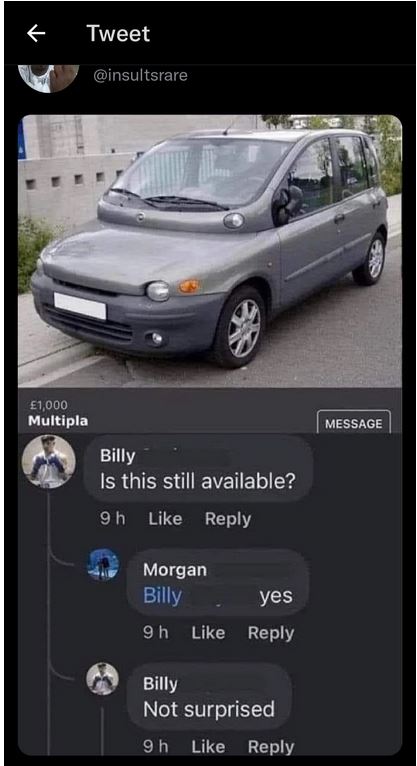 Load More Replies...That's not a Fiat Multipla, it is almost as ugly, but it is missing the je ne sais quoi that the Multipla has.