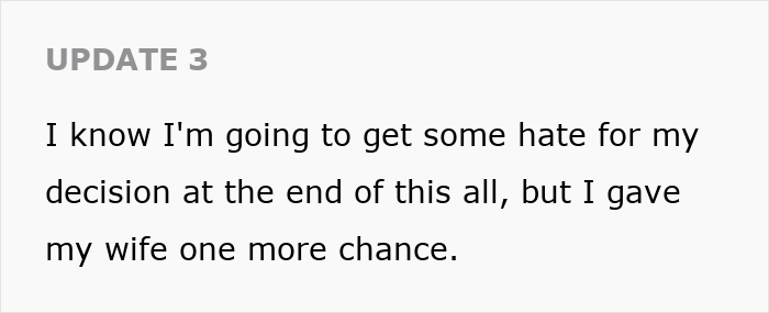 Load More Replies...Well they are going for therapy and things seem to be working. On Reddit, everyone jumps to divorce right away. This seems healthier with therapy
