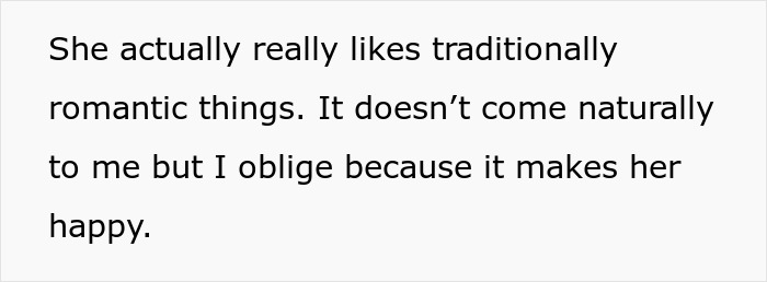 Load More Replies...My partner and I have been together almost 30 years and they STILL don't understand my idea of romance. I want all the things OP does...flowers, opening the car door on date night, telling me how they feel in flowery words yadda yadda. But it's not in them. Instead they do other things ... Let me sleep in on the weekends and take care of the kids. Make dinner when it's my turn but I'm too tired to cook. Sharing an article they thought I'd find interesting. Giving me an extra hug when I'm sad. None of them are romantic gestures in and of themselves but they all say they love me. It's all about interpretation.
