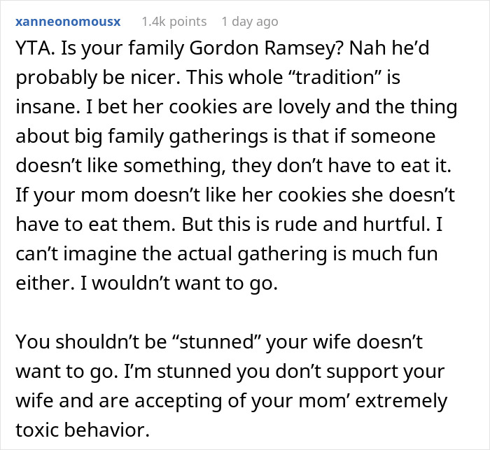 Recently, a man reached out to the AITA community for advice after he called his wife “unreasonable” for backing out of Christmas dinner. Turns out, his mother has a perplexing tradition where she asks women in the family to send “samples” of their desserts and then makes them wait for the results to let them know if they made it to the “food menu.” So yeah, as you can see, there’s quite a lot to unpack here.