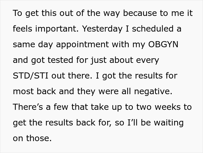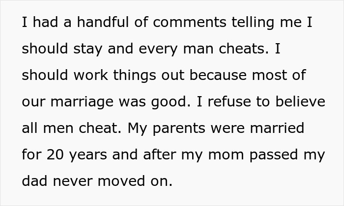 Load More Replies...Food for thought: She didn't see any signs of cheating because he's been doing it the whole time they were together. . I know of a husband that cheated on his wife with her best friend. When wife found out she overdosed. Husband found her, called an ambulance and then died of a heart attack. Wife lived and cut off best friend.