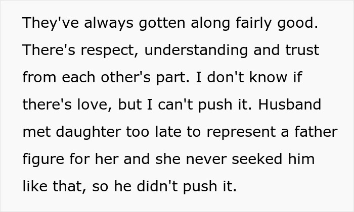 The woman began her post by sharing that her daughter is currently in her second year of college. The student lives in the dorms, but usually, during finals, she comes home to study quietly. The OP’s husband, who’s not her daughter’s biological dad, has changed jobs and is now working remotely. The woman works from the office, so when her daughter visits, she and her stepdad are at the house by themselves.